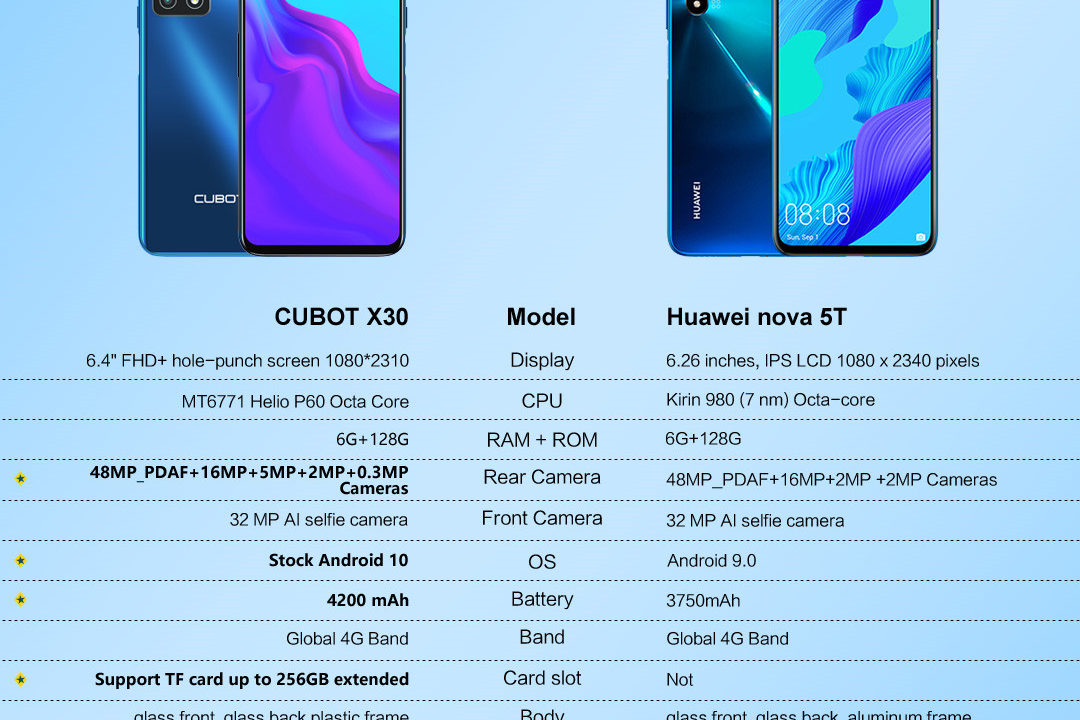 Cubot X30とHuawei Nova 5Tのスペック比較